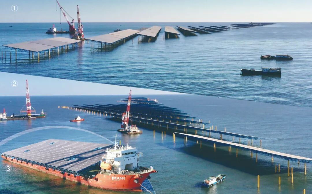 图①②河北华电昌黎海上光伏试点项目,图③运往施工现场的隆基绿能BC二代产品Hi-MO 9组件 公司供图