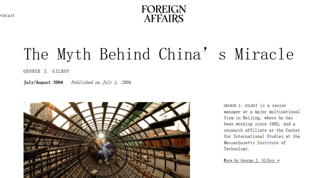 2004年,美国权威媒体《外交事务》杂志刊登了一篇题为《中国奇迹背后的神话》(The Myth Behind China’s Miracle)的文章。作者乔治.吉尔坡(George J. Gilboy)在文中试图为当时甚嚣尘上的“中国威胁论”降温,结论却并非善意的“理性纠偏”股票杠杆配资网,而是一种带着傲慢的否定:中国不值得担心。